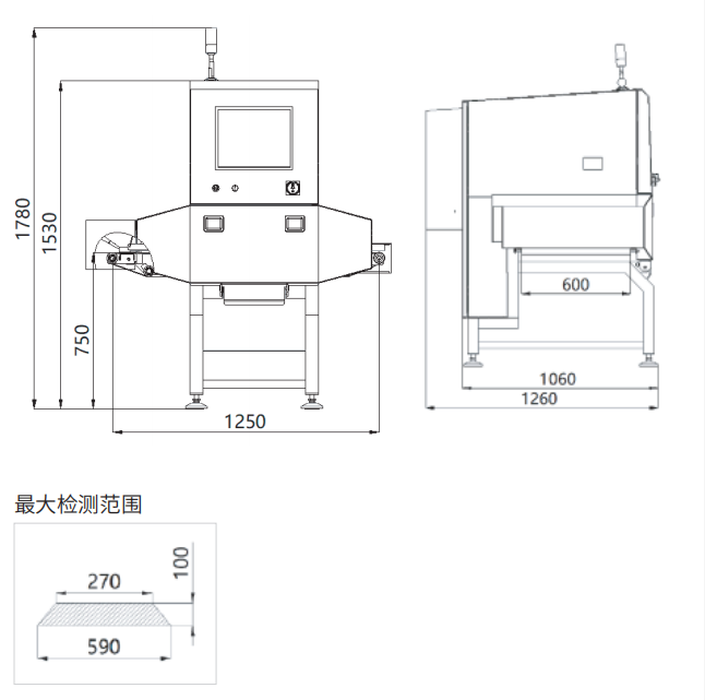 不銹鋼球:0.3mm; 不銹鋼絲:0.2*2mm 陶瓷玻璃球:1.0mm 備注:可檢物的異物尺寸與產品內物質成分、包裝材料、厚度大小等參數有關系。在實際生產環境中,請以實際產品測試結果為準。 |